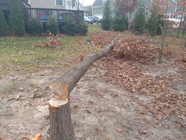 Removal of all limbs and branches off the trunk of a fallen tree, cutting logs (bucking), and sorting debris piles by material/size, leaving your yard clean and clear